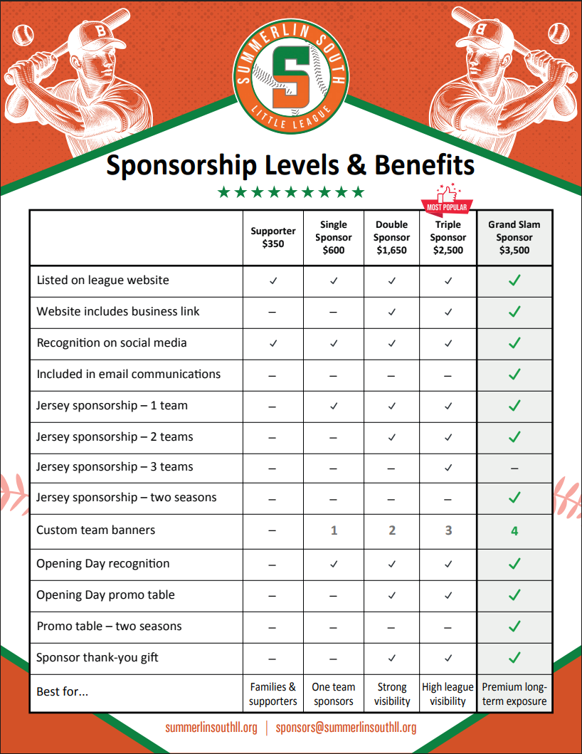 We offer five different levels of sponsorship, the benefits of which are described below. We thank you for considering supporting our league and would love to see you at the fields this season.